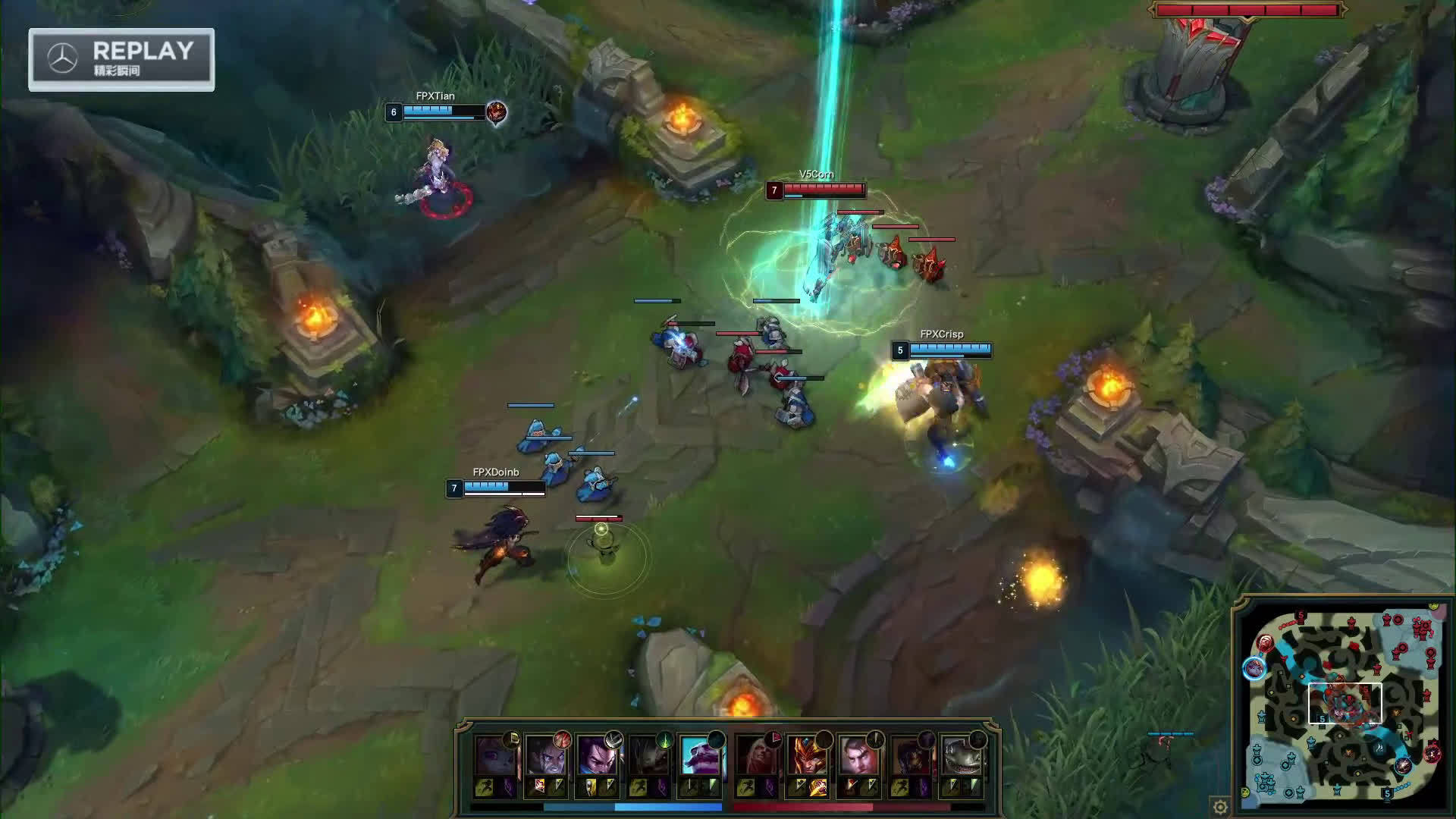 [微博视频] 第一局 FPX的快速支援,从野区打到中路完成1换3