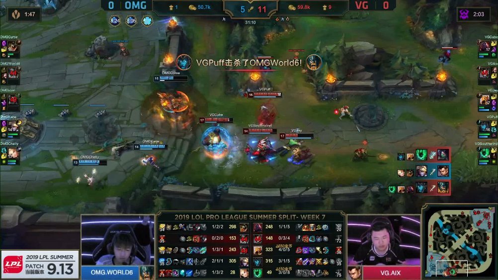 [微博视频] 第二局 VG携大龙BUFF推进,中路打出0换4团战,一波推掉OMG水晶,拿下比赛胜利