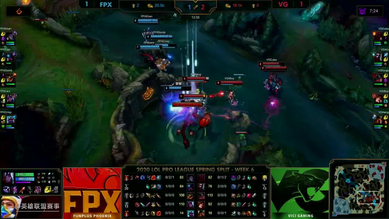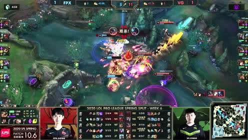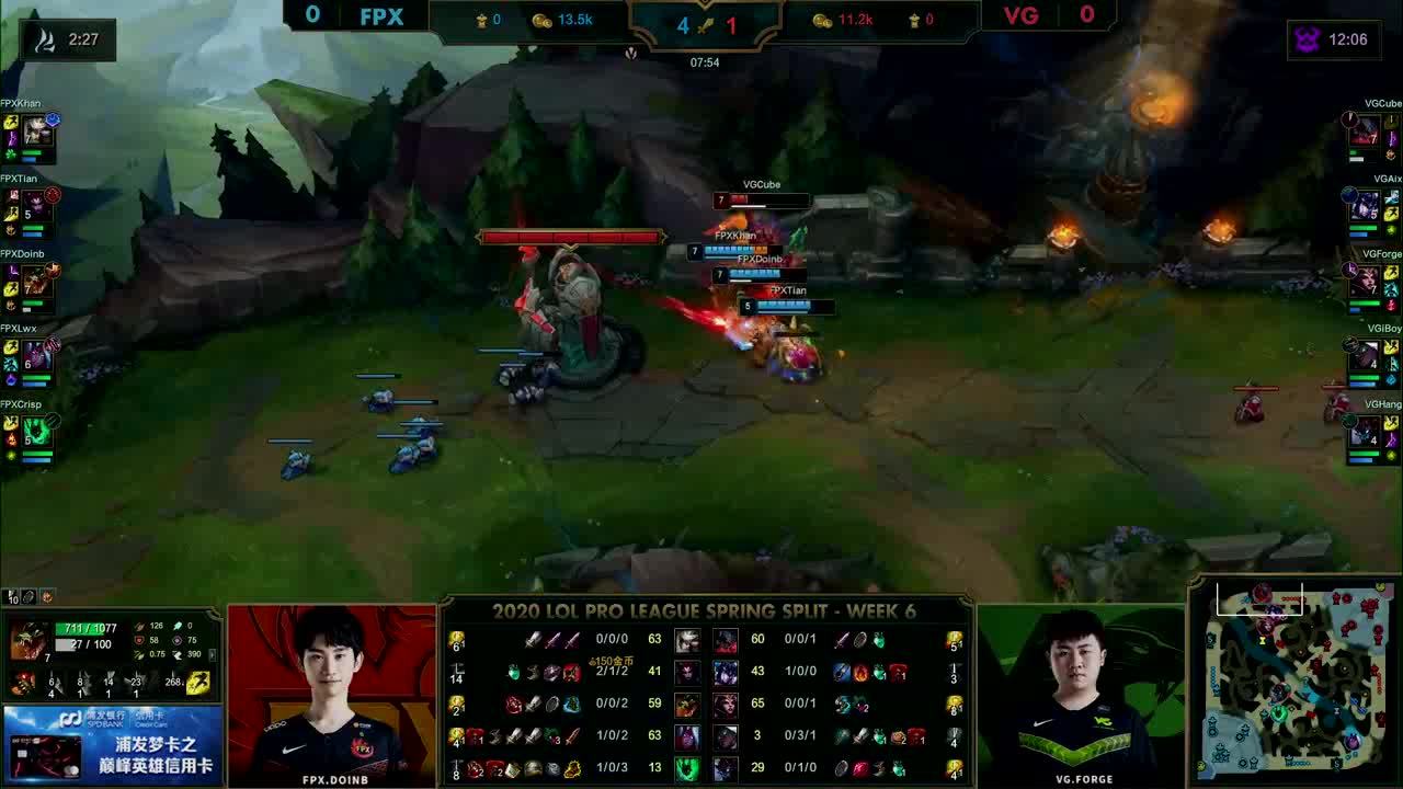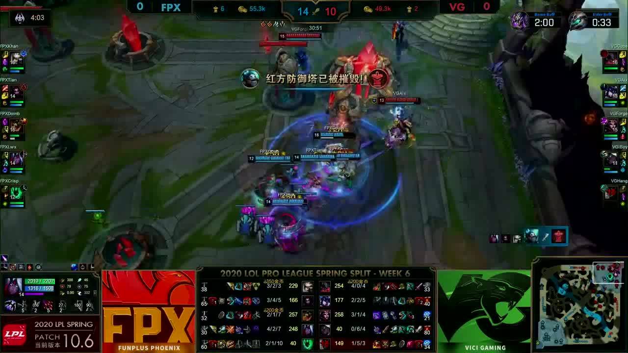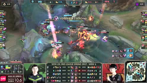 [微博视频] 第一局 利用远古巨龙BUFF,FPX抱团中路强势求战,最终在高地连续击杀VG三人后赢下比赛