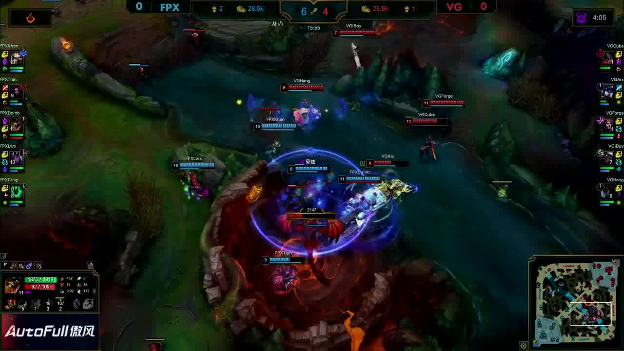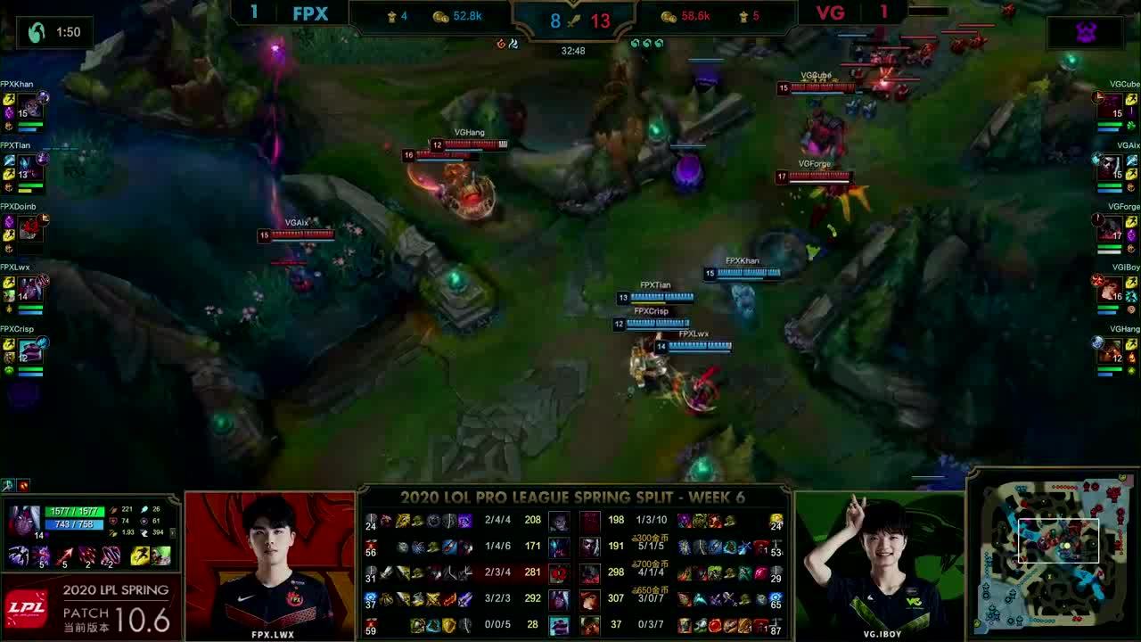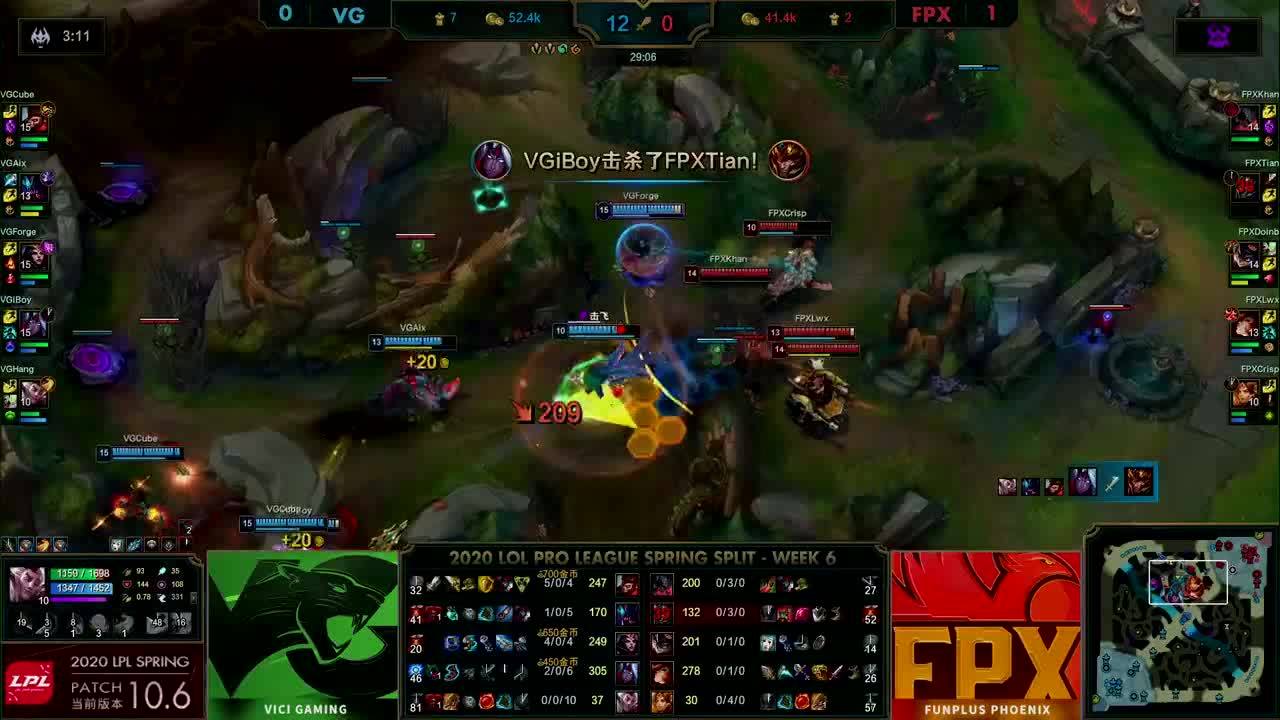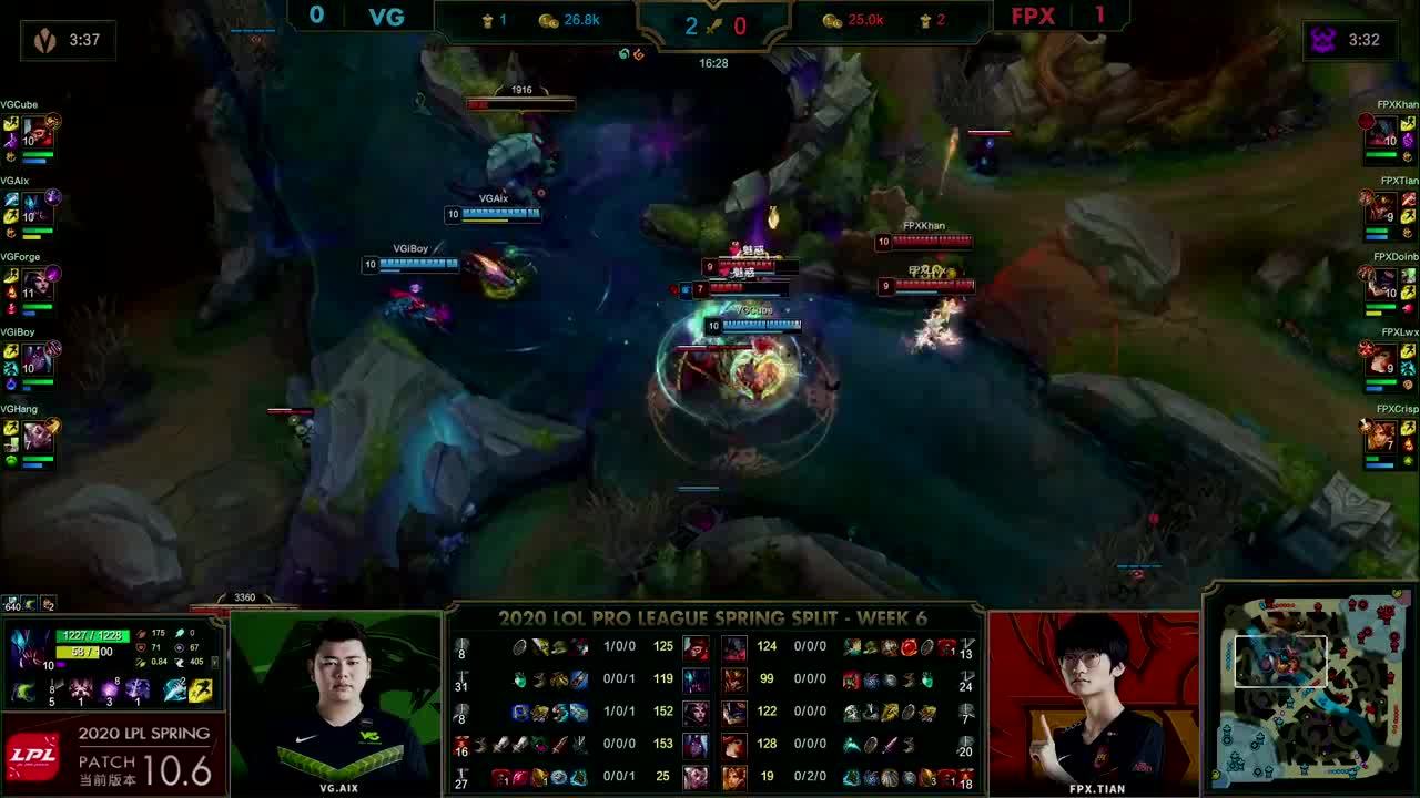 [微博视频] 第一局 利用远古巨龙BUFF,FPX抱团中路强势求战,最终在高地连续击杀VG三人后赢下比赛