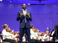 朗诵结束后,全场观众和乐团成员都为科比送上了真挚热烈的掌声,作为乐队指挥家的John Williams和科比拥抱致意,并且似乎还将自己的指挥棒赠予科比留念。