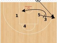5名球员在场上的站位如下图所示。进攻开始后,3号位借助5号位的掩护往篮下空切,如果他成功摆脱防守,那就接球攻击篮筐,这是第一机会;如果3号位没跑出机会,那么5号位立即拉到右侧高位,接2号位的发球。