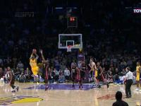 暂停回来,阿泰斯特在右侧边线发球,科比接球面对多人防守往外走,韦德贴身跟防!科比带球到了弧顶处,在比赛还剩下0.4秒时起身、面对韦德投出骑马射箭的三分球!皮球正面打板入框!黑曼巴命中压哨绝杀三分,湖人在主场以108-107险胜热火,迎来8连胜!