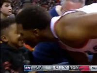 比赛进行过程中,洛瑞与福布斯争抢篮板,洛瑞摔到场边,起身后不忘与场边观战的儿子互动,亲吻了一下儿子后才回到比赛当中,尽显父爱。