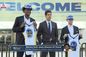 直播吧11月20日讯 昨日选秀大会结束,勇士队的收获是榜眼怀斯曼,第48顺位的马尼昂和第51顺位的杰瑟普,今日,其中两位新秀怀斯曼和马尼昂已经来到了旧金山,总经理鲍勃-迈尔斯带两位新秀向勇士媒体和球迷亮相。