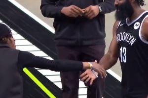 此役,哈登的好友&歌手Lil Baby来到巴克莱中心观看比赛,并和登哥拍手致意。