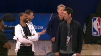 今日,勇士主帅科尔、勇士总经理迈尔斯、提出死亡五小的主教练特别助理尼克-犹恩(科尔身旁的白人小哥)现身场边观看新秀们训练。