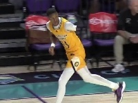 只有一条手臂的他遭到了对手的双人包夹,但他利用一条手臂完成了人球分过,并且助攻队友完成双手暴扣。