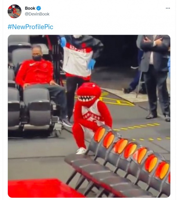 今日布克更推晒出猛龙吉祥物被撵至场边后的图片,配文写道:“个人资料新头像。”