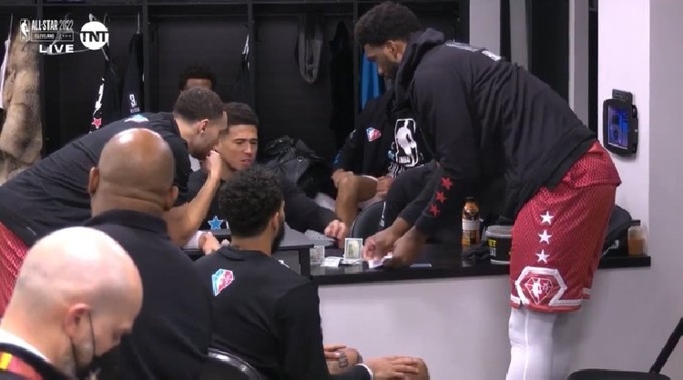 直播吧2月21日讯 全明星正赛将于稍后9:00进行,赛前杜兰特队玩起了扑克。