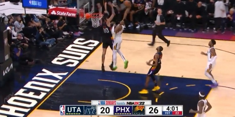 在比赛第一节,爵士中锋怀特塞德在一次防守中完成抢断,随后自己运球快攻一条龙,面对麦基的防守直接单臂劈扣将球打进!