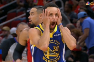 在今天的比赛中,库里在戏耍狄龙命中三分后被自己惊出了表情包。