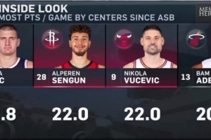 全明星后中锋场均得分榜:申京22分第二 仅次于约基奇的25.8分