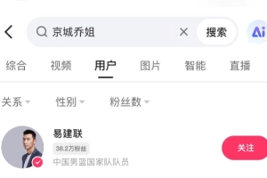 网友发现在打开快手APP搜索界面,搜索“京城乔姐”相关用户时,“易建联”排在了用户搜索页的首位。