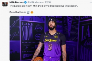 赛后美媒NBA Memes发推写道:“本赛季湖人穿着城市版球衣作战时,战绩为1胜9负。烧掉这垃圾球衣吧。