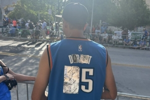在现场,一名球迷身穿“多特”的爆改球衣,可以看出原版应该是一件杜兰特的35号球衣。