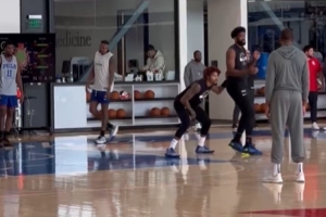 直播吧10月15日讯 在今天的76人队内训练中,恩比德与队友轮流进行一对一的单挑。