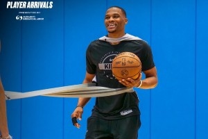 直播吧10月18日讯 今日国王官方晒出球队训练照,球队新援威少已经来到训练馆,与队友会合。