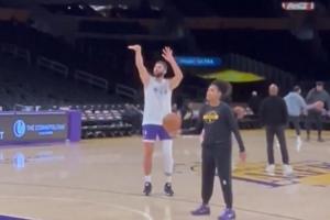直播吧10月18日讯 今天,湖人前锋马克西-克莱伯赛前在球馆内进行了三分训练。