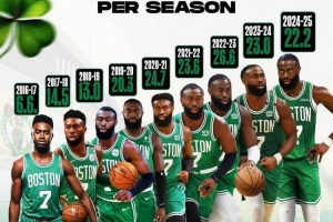 目前场均26分!杰伦-布朗生涯各赛季场均得分一览!已连续6年20+