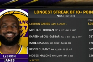 詹姆斯连续1297场得分上双!湖媒:这是NBA历史最难打破的纪录?