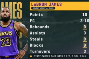 詹姆斯昨日对阵太阳全场0篮板0抢断0盖帽 职业生涯首次!