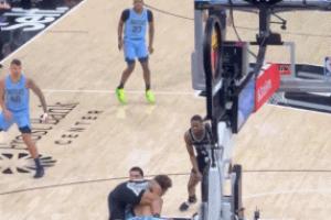索汉站在埃迪身后拍球抢球 后者倒地顺势拉人 两人在地上干起来了