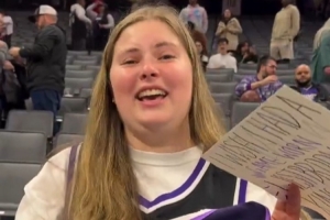 威少将比赛球衣送给女球迷 后者拿着威少生涯所有的球衣&激动落泪