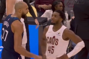 直播吧1月11日讯 昨日NBA常规赛,骑士主场146-134战胜森林狼,前爵士队友米切尔与戈贝尔在比赛中互动。