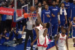 直播吧01月23日讯 NBA常规赛,76人主场128-122加时战胜火箭,终结对手3连胜。第四节最后时刻出现争议,马克西上篮被杜兰特干扰球,裁判没有吹罚。