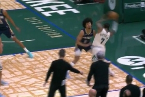有点疼!小凯文·波特进攻肘到皮维面部 回放后普通犯规未升级
