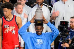 直播吧2月16日讯 NBA全明星正赛冠军赛,新星队47-21大胜星条队夺冠。爱德华兹获得MVP。