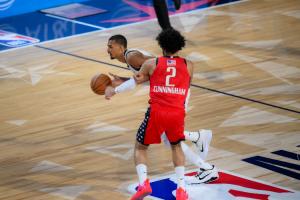 直播吧2月16日讯 NBA全明星正赛冠军赛,新星队47-21大胜星条队夺冠。