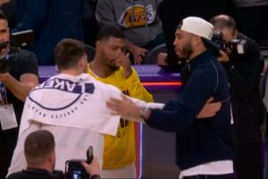 东契奇赛后和绿军众将拥抱沟通 还和养伤中的塔图姆抱抱