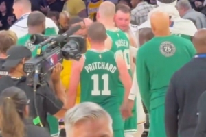 穿错衣服了吧😂斯玛特赛后与绿军球员交流 万绿丛中一点黄