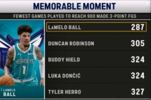 转播方晒出一组数据,NBA历史上投进生涯前900记三分所用场数最少的球员榜单如下: