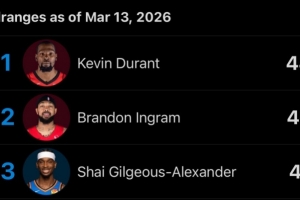 没有阿赞!本赛季中距离命中数前三:杜兰特、英格拉姆、亚历山大