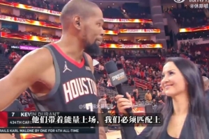 直播吧3月14日讯 NBA常规赛,火箭107-105击败鹈鹕。赛后杜兰特接受记者瓦妮莎的场边采访。