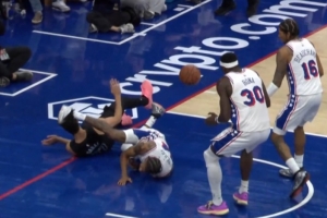 虚惊一场!特里上篮失衡摔在地上肩膀着地 缓了一会儿回到比赛