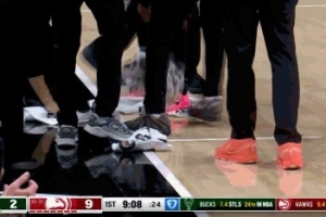 小插曲!雄鹿老鹰比赛场边饮料洒了 多名工作人员一起出动擦地