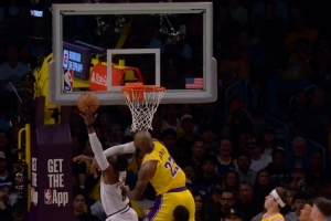 打小哈达威头上~詹姆斯失误后奋力回追 犯规破坏对手快攻