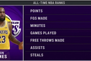 老詹生涯总得分/命中数/出场时间/场次皆联盟第一 罚球命中数第二