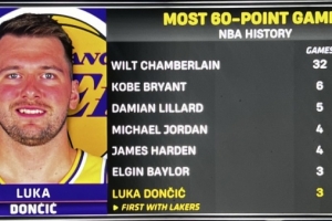 历史60+场数榜:张伯伦32场断档第一 科比6场第二 东契奇并列第六
