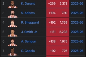 火箭球员赛季至今正负值:阿门+275第1 KD+269第2 申京第6