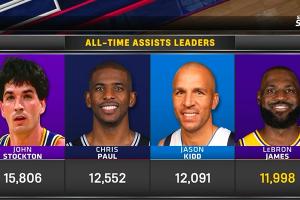 下赛季超基德?詹姆斯生涯助攻数11998 距历史前三仅差93次