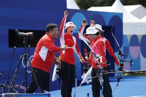 28日在巴黎地标荣军院,中国射箭女队在巴黎奥运会射箭女子团体金牌赛中以4:5惜败韩国队,收获银牌。