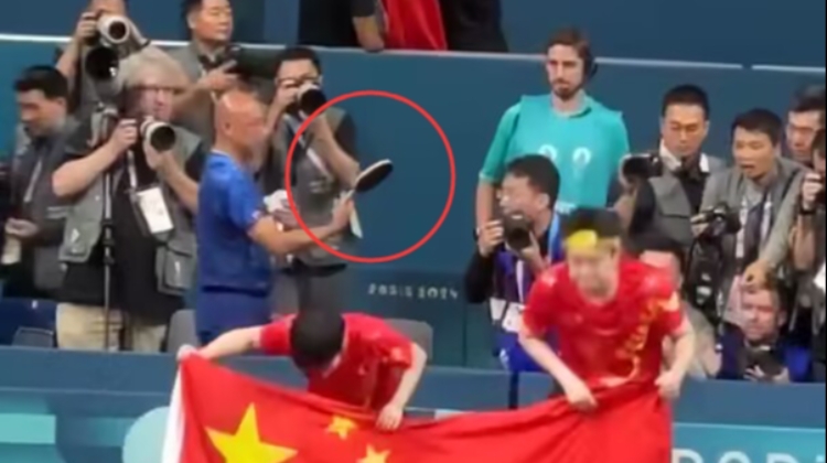 现场球迷传出的视频显示,王楚钦赛后将球拍放在场边,与孙颖莎一同与国旗合影,球拍疑似被一拥而上的摄影记者踩坏。教练肖战发现异常后将球拍捡起表示不满。