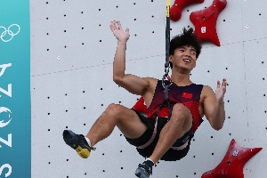 运动攀岩男子速度赛半决赛:伍鹏战胜世界纪录保持者沃森进决赛