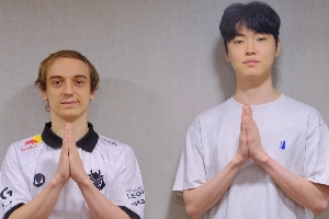 直播吧10月08日讯 G2在社交媒体上分享Caps和Chovy的合照,两人比出相互的招牌姿势;G2官推配文:“Caps神教和Chovy神教相遇了~”。