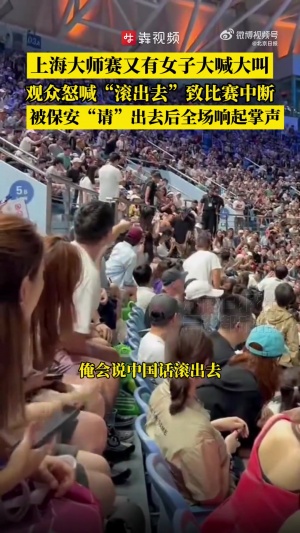 上海网球大师赛1/4决赛,梅德韦杰夫2-0德米纳尔,据报道一名女观众在比赛现场大喊大叫,梅德韦杰夫发球的时候她大喊“帅哥加油”,抛球的时候也在大喊还骂人,引发众怒,现场观众大喊“滚出去”。比赛由此中断,工作人员出面协商后这名女子被“请”了出去,现场响起热烈掌声。